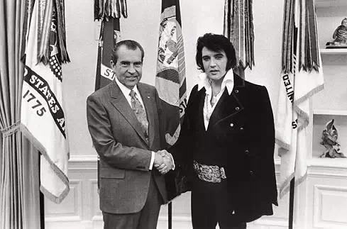 霸气同样可以在握手中体现。在《身体语言密码》中,曾分析过1970年猫王拜访尼克松的一张照片。尼克松的手在上,手掌朝下,猫王则反之,这意味着尼克松在这次握手中占了上风。