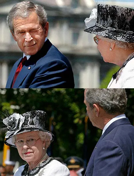 现场一片尴尬,小布什机智地向英国女王眨了眨眼睛。不过,女王并没有什么多余的表情来回应这个眼色。