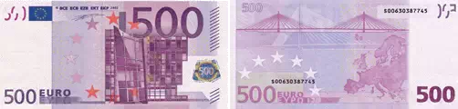 欧元的票面由窗户、大门和桥梁三个基本建筑要素构成,分别代表欧盟之间的开放、合作与沟通精神。与此同时,各个面值的纸币,从小到大,也分别反映了各个时期的建筑风格: