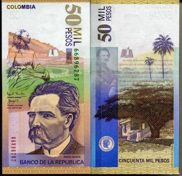 2000年发行的哥伦比亚5万比索面值的纸币,与其他纸币最大的不同是……它可以竖着看。纸币正面印着的是哥伦比亚作家豪尔赫·伊萨克斯(Jorge Isaacs)的肖像,而纸币背面印了他1867年出版的的小说《玛丽娅》中的一段。