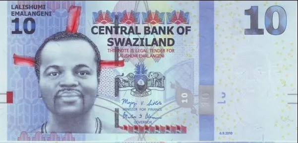壹堆饭们莫要惊慌,此处壹读君贴出的并非是某通缉犯的大头照及悬赏金额,而是非洲东南部国家斯威士兰的货币——里兰吉尼,而纸币上所印的,正是斯威士兰的现任国王姆斯瓦蒂三世。斯威士兰中央银行,你们发行纸币的时候完全没有给国王好好修一下图,到底是怎样的居心……