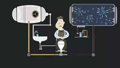 把黄水分隔出来的目的是让它在经过一个浓缩、渗透的系统后形成液态肥料,就地可用。剩下的东西要进入一个反渗透系统。壹读君(yiduiread)帮你回忆高中化学,一层膜两边液体浓度不同,比如污水和淡水,这个系统就是让污水向淡水渗透,把污质与水分离开,最终形成清洁水。这个水的质量是非常高的。高到什么程度呢?跟比尔·盖茨上次喝进去的粪便提炼水是一样的。