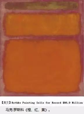 抽象派画家马克·罗斯科的作品《橙、红、黄》,以8688万美元(约5.47亿人民币)成交,对于罗斯科的作品,业内也有多种解读。有业内人士认为他在利用微妙色彩对比所辐射出的情绪,通过几何本身来挣脱几何的控制,如同每个人都是在自己的命运中摆脱命运一样。
