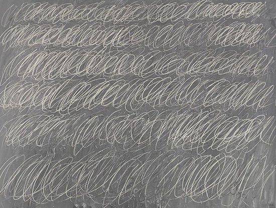 他在画布上画了发灰的黑板又在黑板上画了六行连续的圆圈,风格看起来非常随意。“虽然乍一看让人不得要领,仔细品味却能发现他已将其神韵悉数捕捉……汤伯利在欧洲历史和古典神秘主义的熏陶下,他的笔触变得率性,本能且主观”。