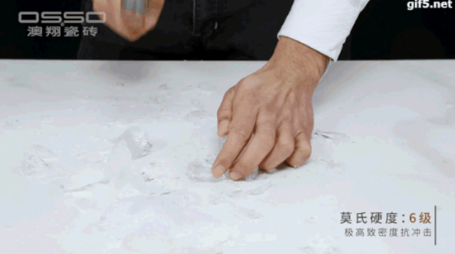 为了测试大岩板的抗震抗冲击,我们用小石锤暴力砸击岩板上的冰块,发现岩板表面仍完好无损,岩板坚硬度毋庸置疑!