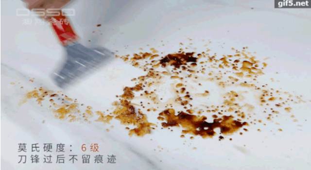 其次,我们选择用刀铲去铲“岩板火焰三文鱼”之后留下的油垢,轻轻松松即可清理干净,且产品表面不留任何划痕,耐磨防污能力MAX。