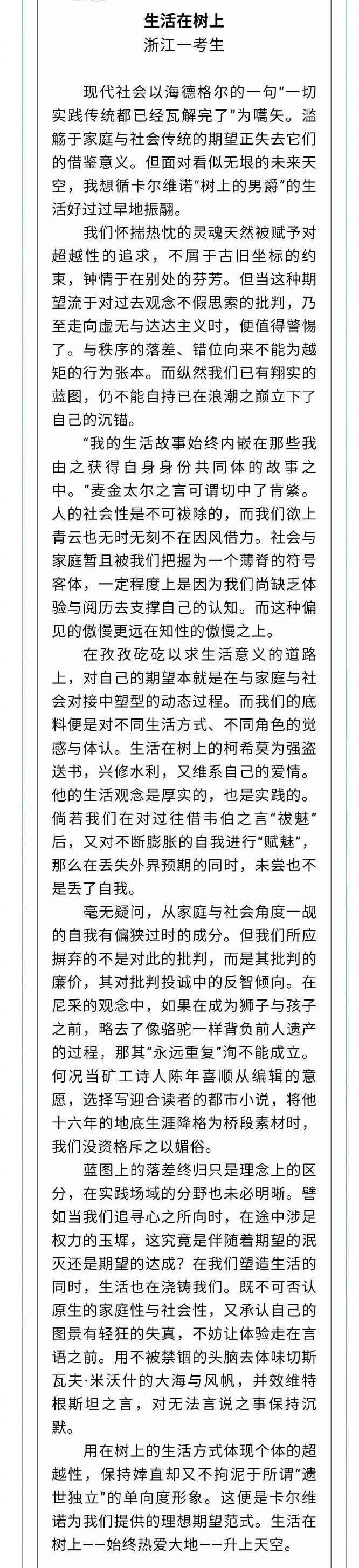 但我不同意少数老师称赞《生活在树上》,表扬考生有“特立独行的个性”,也不认为考生是在“放纵自己的个性”。