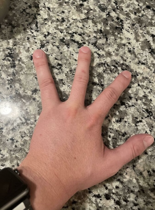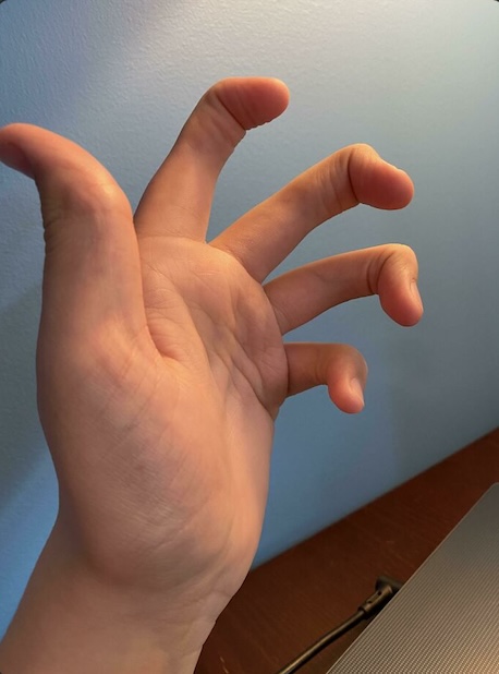 而这位小哥手指的数目倒是正常,但左手的所有手指,中间全没有关节。