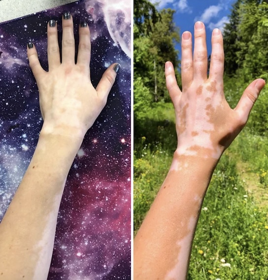 患白癜风的妹子,肤色从冬天到夏天会经历神奇的颜色变化。