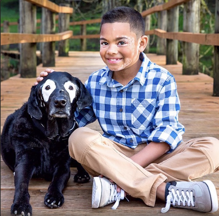8岁的小男孩Carter Blanchard和他的狗子Rowdy都患有白癜风。