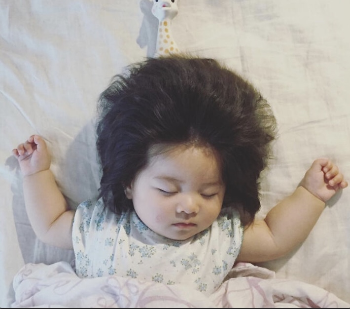 小女孩刚生下来就有一大堆头发,出生后还不停地疯长。才7个月大,发量着实让人羡慕了…