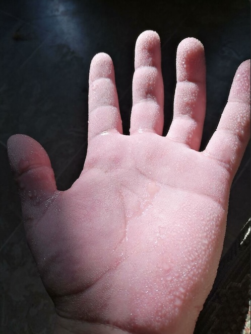 这位小哥患有罕见的多汗症(Hyperhidrosis),手掌和脚掌时刻都被汗湿透…