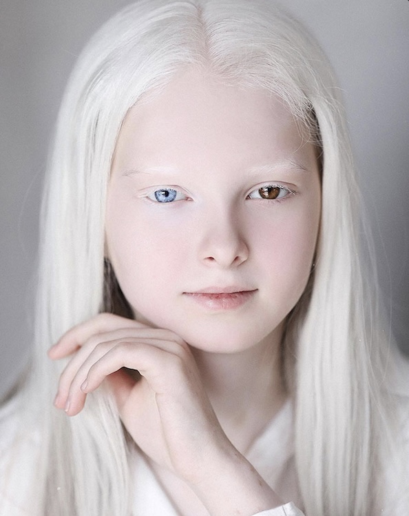 小姑娘Amina Ependieva同时患有白化病和虹膜异色症,这让她拥有极其罕见的发色,皮肤和虹膜。
