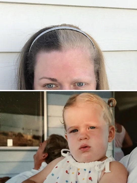 一位网友说她妹妹从出生起,头发和眉毛就是一边金发一边黑发,1989年和现在的对比照…