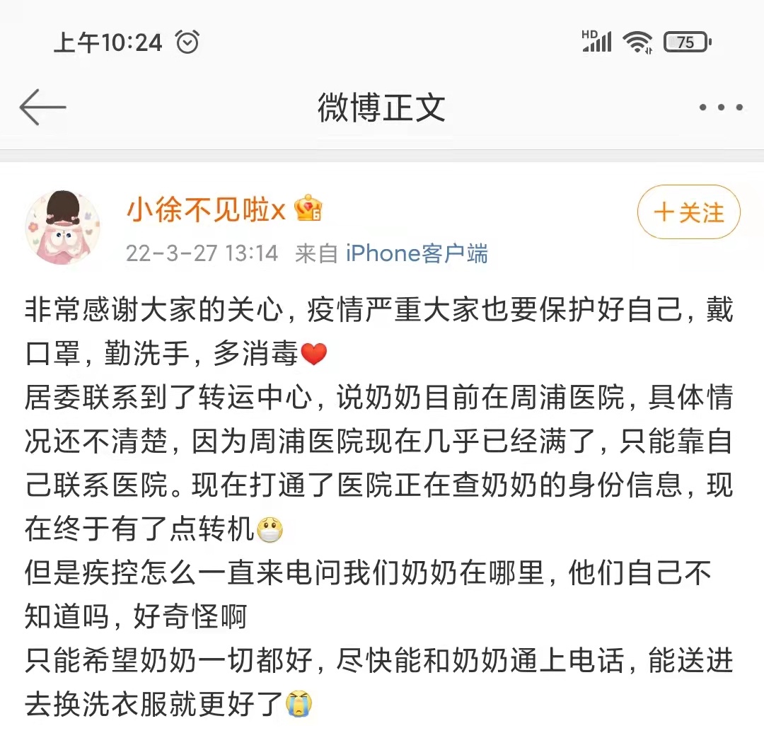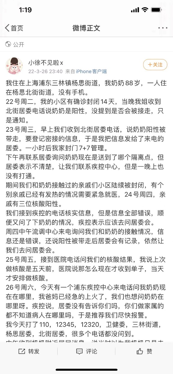 26日——此时奶奶已被大白带走三天——浦东疾控中心打来电话,询问:“你奶奶到底在哪里?”