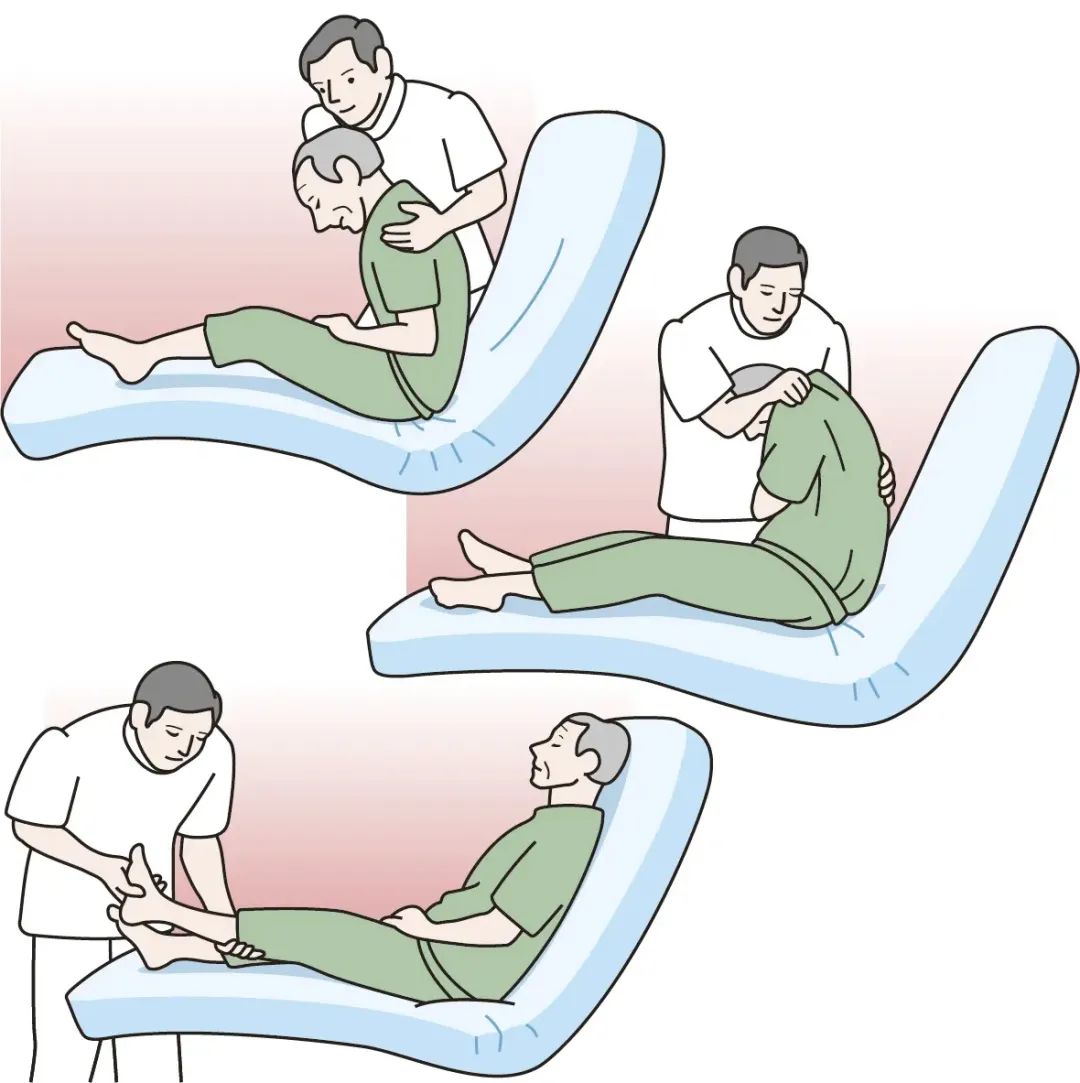 对长期卧床的老人鼓励并协助翻身更换姿势,以避免皮肤长时间受压,至少每2小时翻身一次,翻身时应将老人身体抬起,避免拖、拉、拽、推等动作。有麻痹的老人注意不要将身体麻痹的一侧压在下面,如因交换体位必须压在下面时,要尽量缩短受压的时间。在身体空隙处垫软枕或使用气垫床、水褥等有弹性的保护垫等方法以减轻局部受压。长时间坐轮椅的老人应每隔30分钟活动身体或由照护者协助老人站立片刻,以缓解局部的压力。