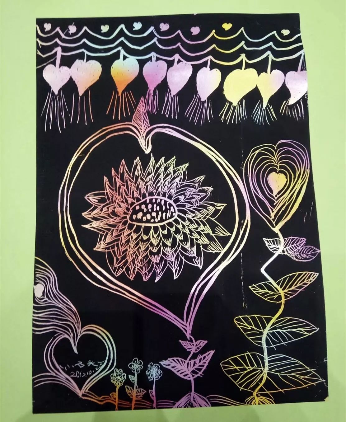 最后,用我女儿小石头送给校长的画结束我的分享,小石头说:画中的莲花是校长,莲花中充满了爱心,那是校长的慈悲和爱撒满人间,我们就是小花、小草,得到校长的滋养和帮助,还有小菩提还是个嫩芽芽,还在妈妈肚肚里也得到校长的爱。画面最上方的一排爱心放着光,她说这是爱的世界,光明的世界。