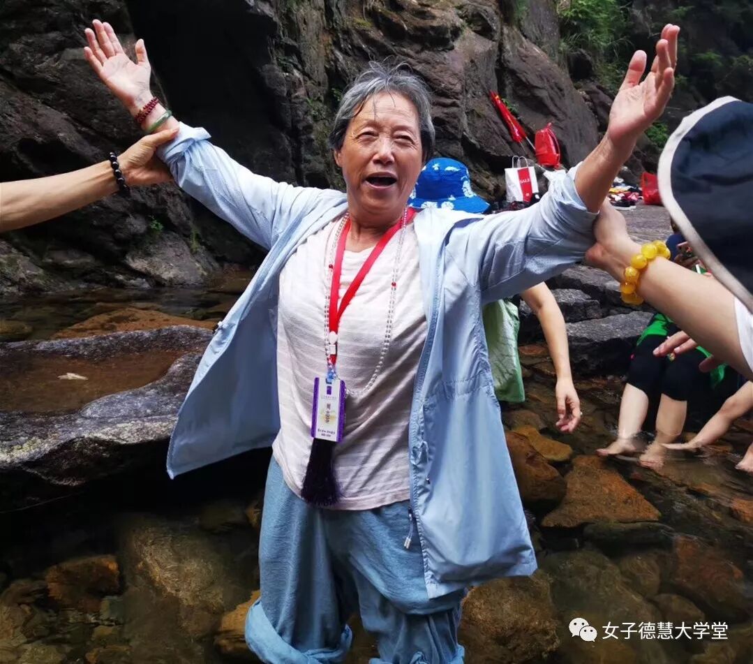 下午参观青龙瀑布,我没有下水,怕稍有闪失会引起我身体的代谢紊乱。我因班替式综合症切除脾脏四十年,免疫机能低下,一有风吹草动,就会低烧不止,什么药都不管用。但当我看到校长的召唤,突感信心倍增,毫不犹豫的下水了,并和同学们一起呐喊。喊着喊着,我的眼泪又流下来了,流过脸颊、脖颈到心口,我顾不上擦,顾不上丑,让这瀑布的泉水清洗我这七十多年的苦累、烦恼委屈、顽习妄念,统统被清洗干净,从此树立信心,完善自我。