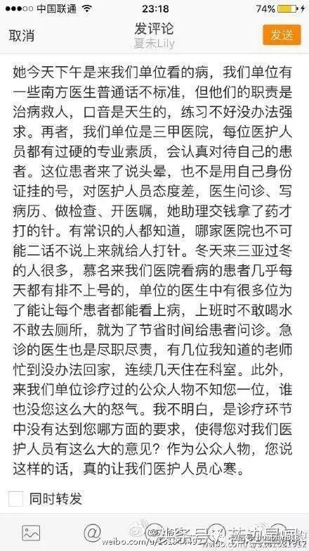 虽然现在医患关系是热点话题,有人表示理解和力挺,但是网友表示:不喜欢她主要是1.歧视方言口音2.百度药品说是有副作用没有皮试。