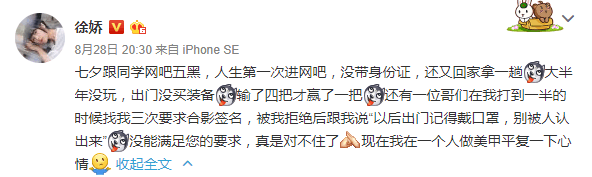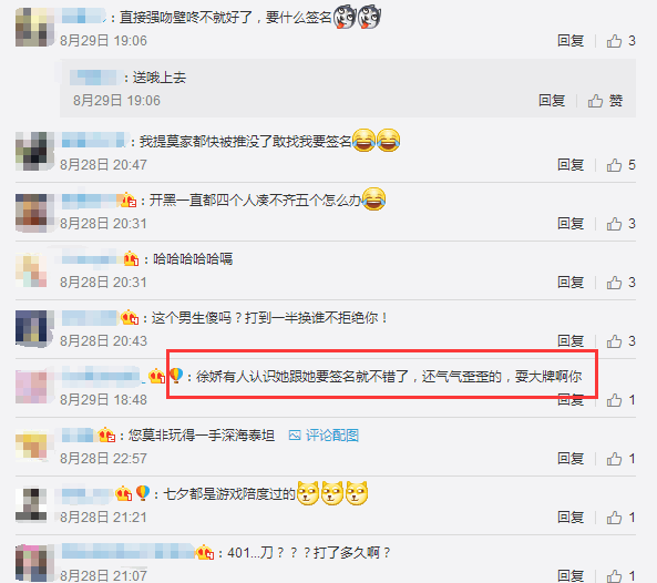 作为明星拒绝粉丝的签名确实说不过去,但毕竟是玩游戏玩到嗨的时候,徐娇耿直上微博直接吐槽自己的遭遇,下面粉丝也是褒贬不一
