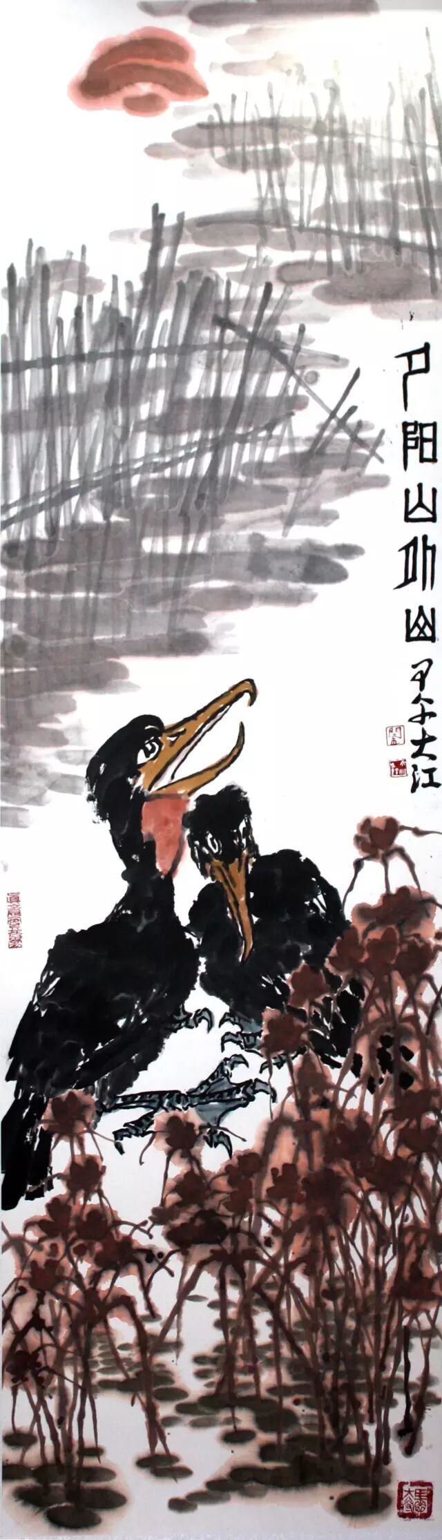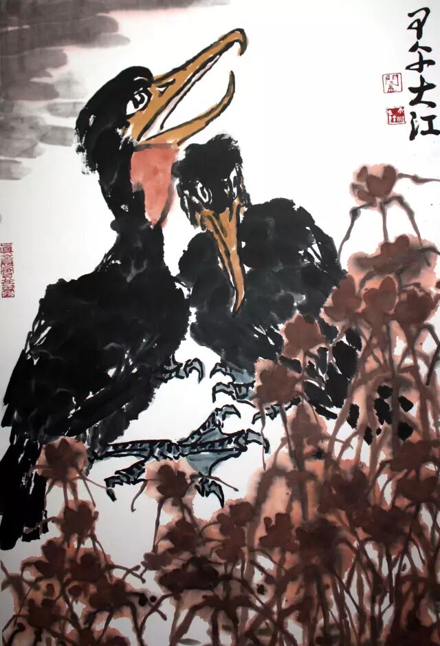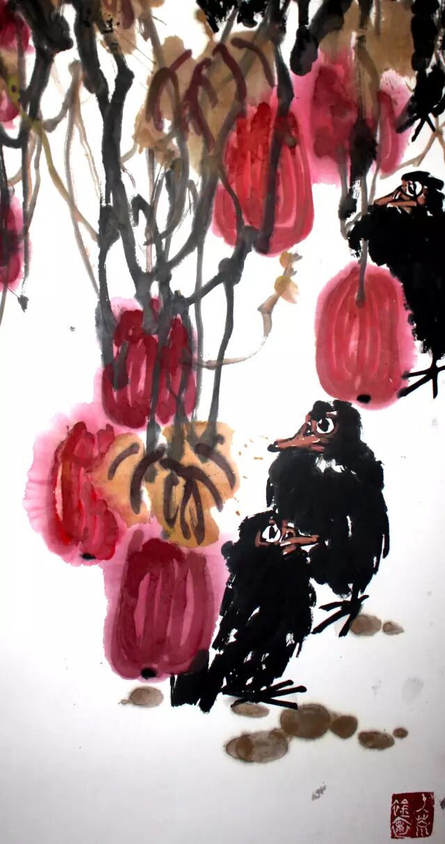 观大江的花鸟作品,初得稚拙天真之趣。故不以华丽争宠,不以喧嚣争势。仅以墨笔画之,殊草草,缀丹粉而已。就是这么一种好似不经意的挥洒,传递出“夺造化之妙”的“巧”。这里的“巧”源自画家的生活积淀,是对生活的提取与凝练,最终自然地流露于笔端。只是用简洁与质朴的看似稚拙的语言就阐释出来的“道”——生存之道、为人之道、处世之道。