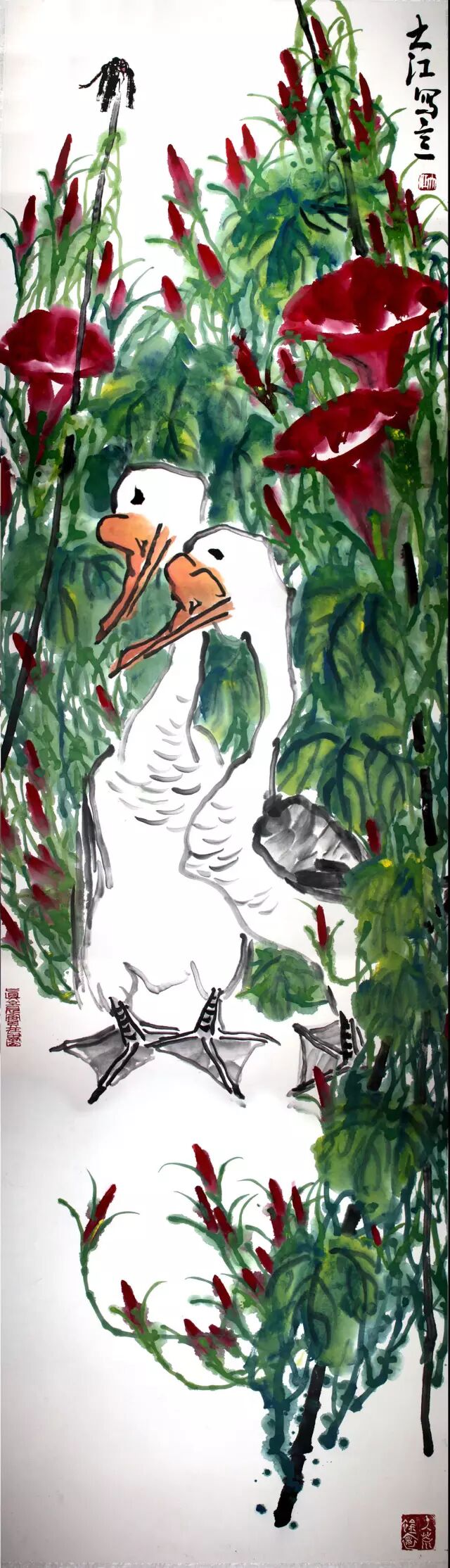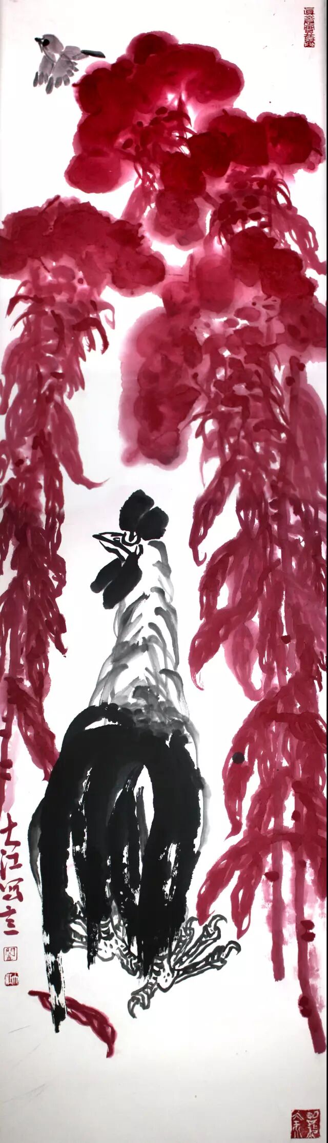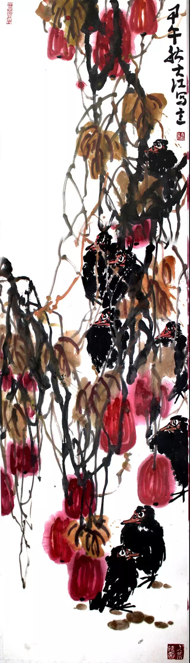 在齐白石老先生的画中,就曾感怀于他那文人笔墨的隽永与市井中直白坦荡的色彩之间的大胆结合,再以最纯朴的生活素材为对象,表现出画家在“巧”与“拙”之间的量度。虽不能将大江的作品与之较短长,但能在其中找到某些相似性,这正是他对前人继承的修炼。继承是为了更好的创新,他在数年辛勤的笔墨耕耘中,锤炼出自己的独特语言:以文人笔墨的透彻结合民间年画的纯朴色彩,把墨与色的界限放在新的空间去度量,幻化出新的色彩,这里既有传统的精髓,又有当下思想与生活的印记。