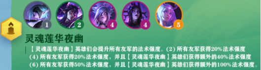 灵魂莲华夜幽:更为强力的“法师”羁绊,全体法强增益+额外的单体法强增益。