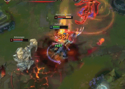 中期狗头不适合单带,虽然推塔快单线收益高,但是狗头没有位移怕被抓,而且拖到后期对方ADC装备成型了狗头也不好冲后排。最好是两件套的时候逼团,只要减速到脆皮就上去E破甲追着Q,3个Q就能带走脆皮。