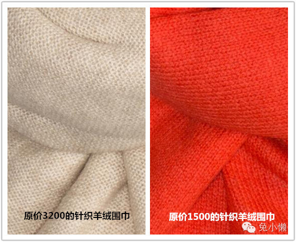 同一品牌的针织羊绒围巾,很遗憾找不到两个颜色一样的图。但是这一张的差距更大,左边的羊绒围巾还可以看到熟悉的蓬松感和软糯感,右边的你要是说它是羊毛的我绝对信啊啊啊!