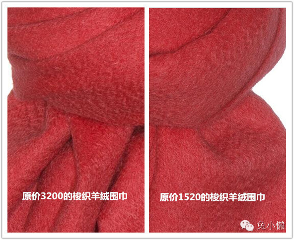 同一品牌不同款式的梭织羊绒围巾对比,特意挑了相同的颜色,可以清除看出来一分钱一分货,这对于同一个品牌尤为明显——便宜的那一条毛绒感和立体感明显没有贵的好。
