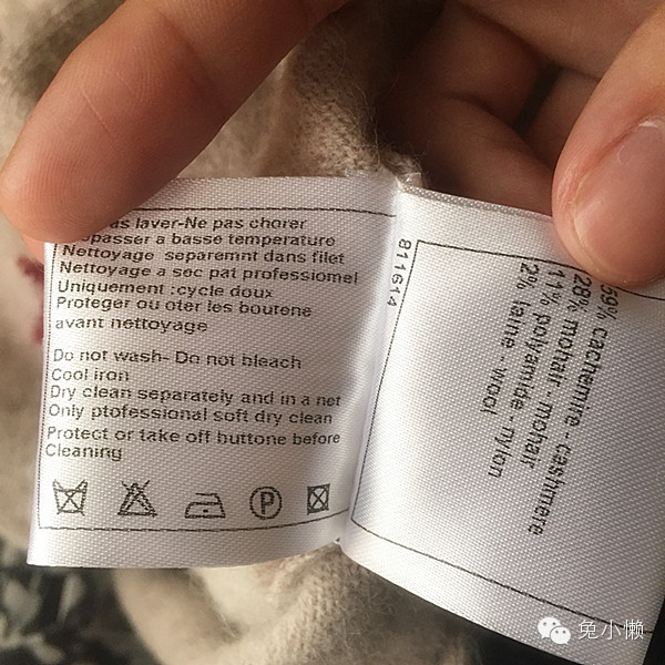 因为,这些水洗标,它首先得是一个“免责声明”。因为干洗对于羊绒和羊毛制品来说,是一种可以说是“万无一失”的洗涤方式;而水洗,因为实际操作时每家的情况都不同,会有出现洗涤方法不当而弄坏衣物的风险。品牌自然是不愿意负担这个风险的,所以它一定只会印万无一失的那种方式。想象一下,如果印了“可以水洗”但是又有人洗出了问题,那么消费者自然不会放过他们。