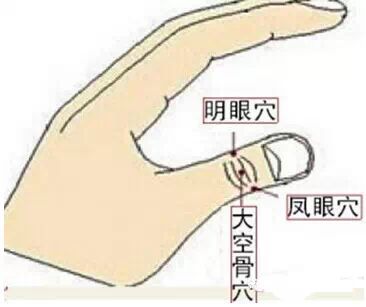在我们的拇指上有三个相邻接的穴道,分别是明眼、凤眼、大空骨(如上图)。