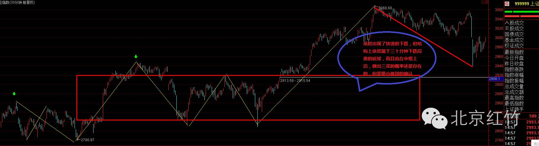 三十分钟反弹段落的(上下上)第一笔上已经出现但还未结束,需要分钟级别做出三买后完美才可结束。