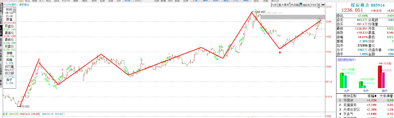 目前煤炭红色箭头的位置为防守线,不破这里可以震荡或者上涨都可以,主观上有新高的可能,但还需要量能继续努力,而且一旦新高就要注意风险了。