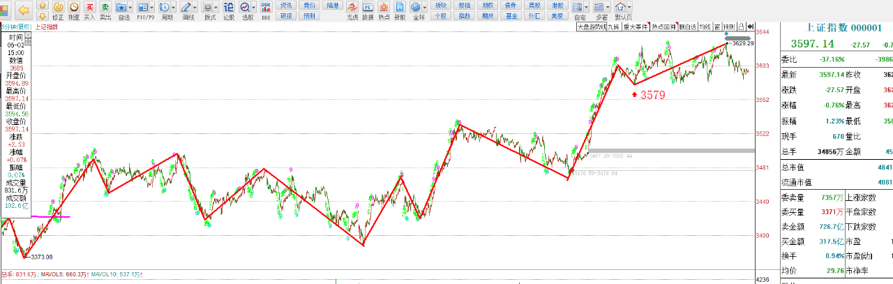 不过一切都在机构之内,今天指数小幅高开不管是沪指还是创业板都有了新高,就说明五分钟级别防守线成立了,沪指的防守线在3579点,创业板的防守线在3169点。