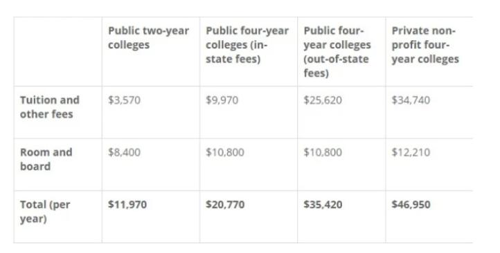 根据QS世界大学网站的数据统计表,我们可以看出,私立四年制大学一年平均是46,950美金,公立大学的一年平均学费是35,420美金。