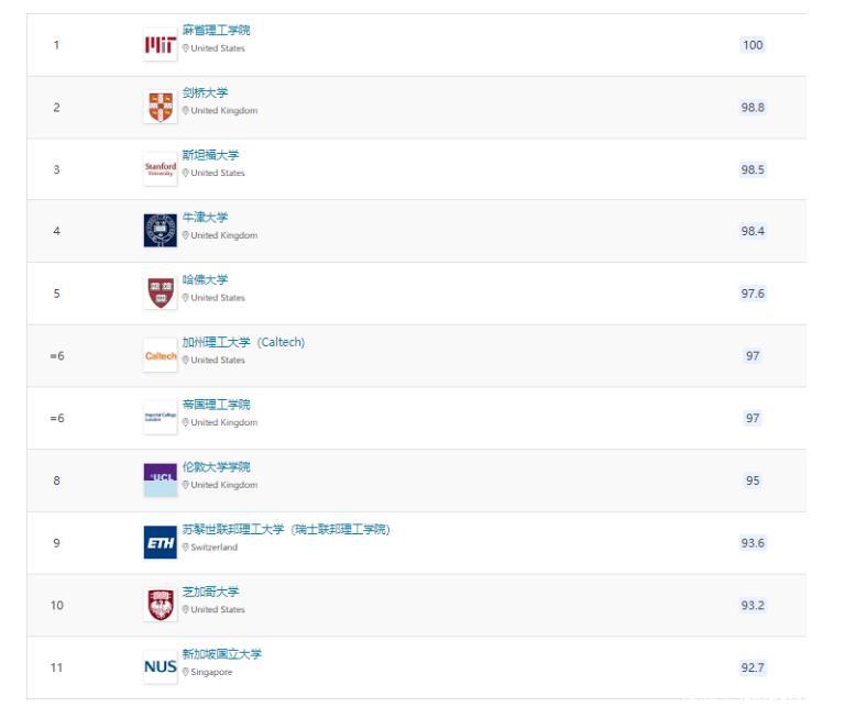 根据2023年的QS世界排名来看,英美院校仍是世界“顶流”,前10名中有5所美国大学,4所英国大学,第九位是瑞士的苏黎世联邦理工大学,新加坡国立大学紧随其后,位列第11位。