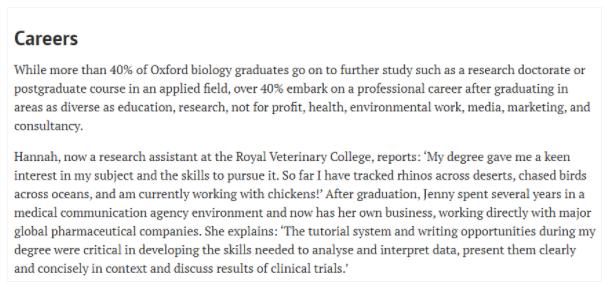 虽然超过40%的牛津生物学毕业生会继续深造,例如攻读硕士或者博士学位,但也有超过40%的毕业生在教育、研究、非盈利、健康、环境工作、媒体、营销和咨询等行业颇有建树。