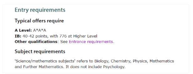 想申剑桥自然科学-生物方向,需要达到怎么样的标化成绩呢?官网给出的信息如下: