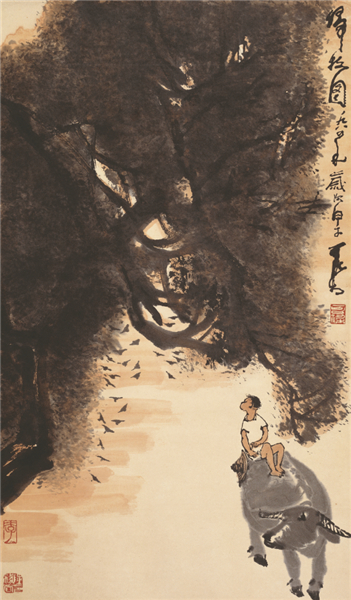 李可染什么时候开始画牛的呢?按李可染自己的说法,他画牛始于1942年在重庆乡间见到邻居家的水牛。据最新的研究,他可能30年代在家乡徐州便开始画牛,惜无作品存世。当时的牧牛图,可能是其在人物画创作中偶尔为之,而且都是古典牧牛题材的一种延续。40年代“开始”画牛,则是在抗日战争的特殊时期受到水牛勤劳、倔强、朴厚精神的感召,在得到郭沫若对其牧牛图的推崇和徐悲鸿对其技法的肯定之后,开始将牛作为自己重要的创作题材,终其一生不厌其烦地进行创作。李可染画牛的意义还在于他终生以牛为“师”,“师牛堂”是他最常用的堂号。他一直以牛的精神自勉,用牛一般坚韧苦学的精神默默耕耘于艺坛,终于成为一位开宗立派的山水画大师。牛的精神不仅是画家一生的追求,也是他本人精神气质的外化体现,更是中华民族精神气质的象征,正如郭沫若所言,李可染笔下的牛具有坚毅雄浑,无私拓大的中国气派。