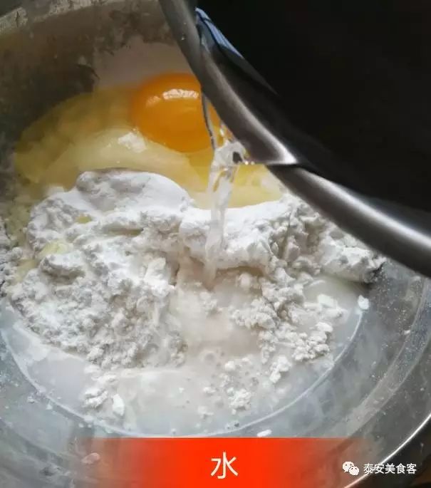 第三步、盆中放入面粉50g和淀粉100g、鸡蛋一个、再加入水边加边搅拌,这样才能控制水的量,一直搅拌,搅拌至厚度和酸奶差不多湖就可以