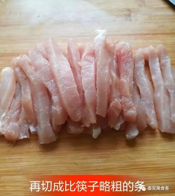 第一步、里脊肉洗干净切成厚片再再成比筷子稍微粗的长条,大小均匀放入碗中