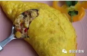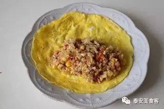 11、将炒好的蔬菜末放在蛋饼上,然后折叠过来,将其包上。
