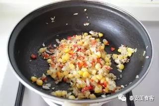 8、放入红黄甜椒末。