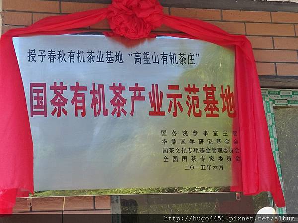 由「国务院参事室主管」、「华鼎国学研究基金会」、「国茶文化专项基金管理委员会」、「全国国茶专家委员会」,共同受予:『春秋有机茶业基地-高望山有机茶庄』【国茶有机茶产业示范基地】牌匾