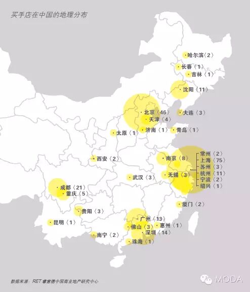 中國大陸的地理分佈中國買手店在中國大陸主要分佈在華東、華北、華南地區經濟發展水準較高且對品牌有一定認知度的一線城市。