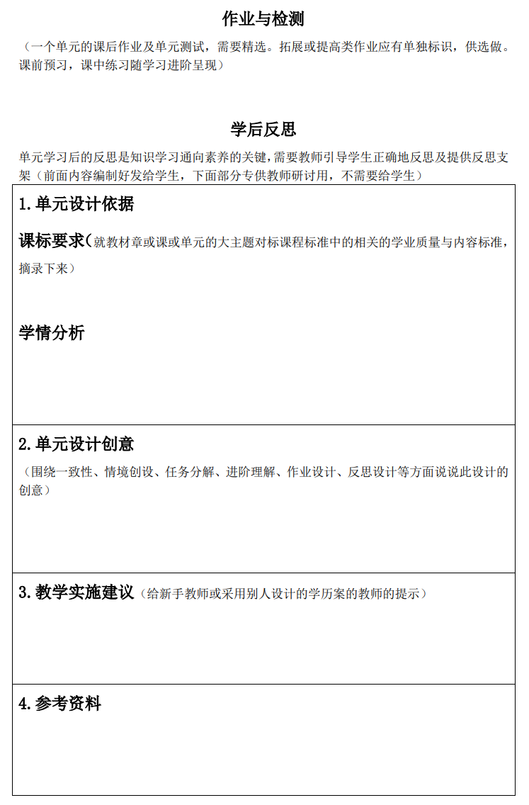 其中,设计单元学历案有几项关键技术:单元学习目标需要依据学业质量编制,要“看得见”核心素养的落实;评价任务的设计要先于学习过程,以便达成教学评的一致性;学习过程的设计需要体现进阶性、结构化与实践性特征;作业与检测的设计需要体现整体性、校本化以及与目标的匹配度;学后反思是单元学历案的重点,教师需要对照素养目标,按反思的层级设计好学后反思的路径或支架,引导学生实现教下去的是知识,留下来的是素养。唯有如此,教师才会从教书走向育人,让教育回归育人本质,也才能真正实现新课程所倡导的课程育人。