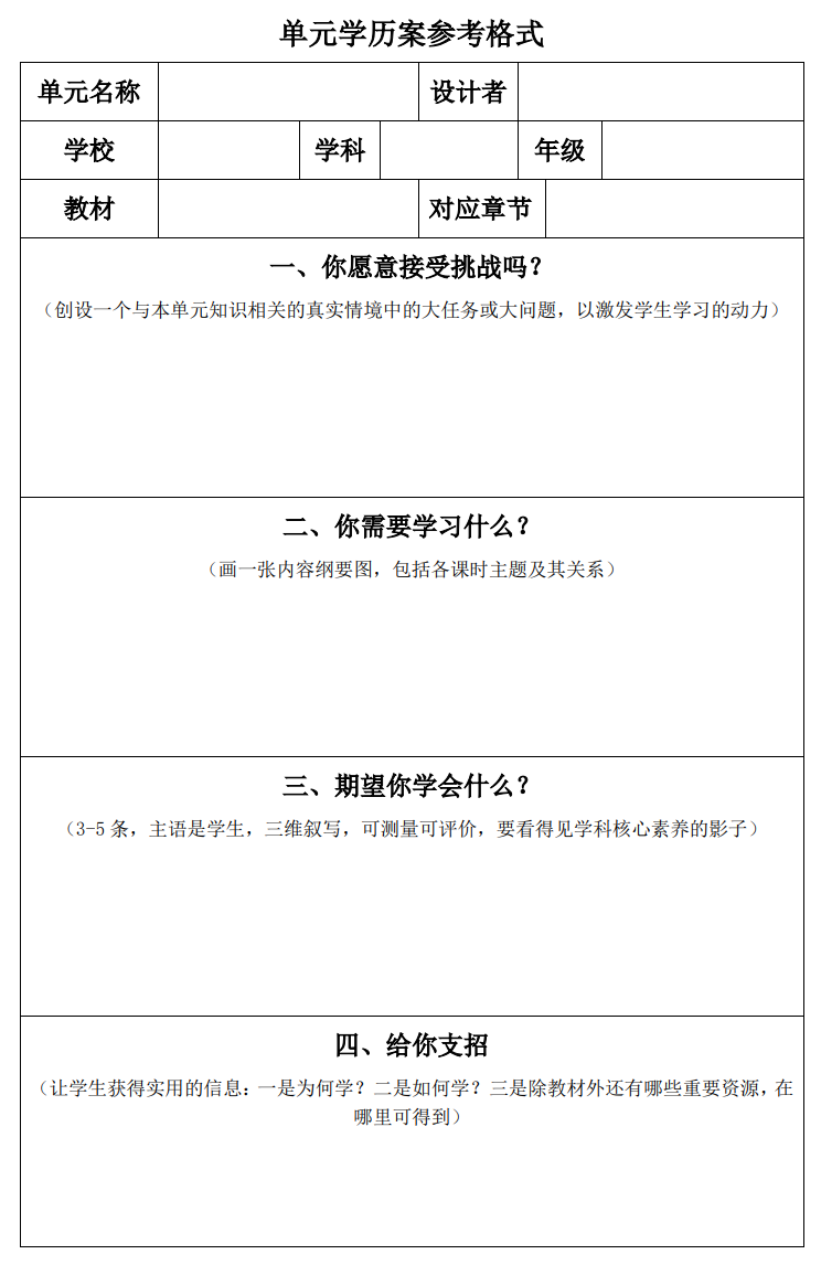 单元学历案是基于上述理解而建构的,它是教师为学生学好教材、以单元为单位开发的一种助学方案或支架,包括单元名称与课时、学习目标、评价任务、学习过程(含资源与建议)、作业与检测、学后反思六个要素。