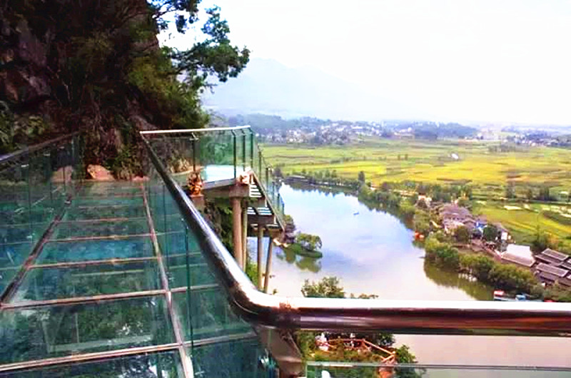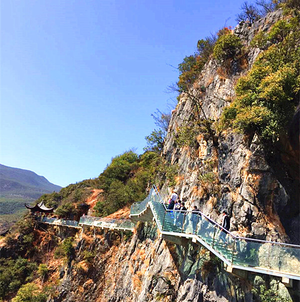 (体验前所未有的刺激)穿过红军桥后靠右前进,抬头便能看到半山腰的玻璃栈道。玻璃栈道凌空架设,所以上去的路也是十分陡峭,但是陡峭之中有奇趣,可谓一步一景!再走进些时就隐隐感觉到玻璃栈道惊险的魅力,玻璃的表面光滑透亮,能很清楚的看到下面的峭壁,从栈道上往下看,景区的美景尽收眼底。