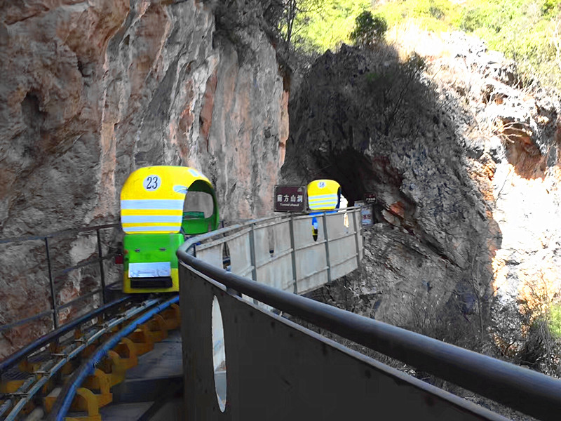 坐着滑道车绕到山谷的后面看(观音飞瀑、观音洞),走到滑道车站乘坐滑道车进入观音峡谷,滑车沿着高高的山崖峭壁自动前行,管轨电动滑道车从隧道游览区出发,绕山而行直达。观音峡峡谷入口处,全长1200米,落差30余米,游客可自行控制车速,车速可达7公里/小时,动感十足,向上转过几个山峰,车站到达。